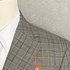 This listing is for a new with tags Tallia Men's 40 Long Verdello Suit Jacket. Fully Lined, Two Button Closure, Two Front Flap Pockets, Welt Pocket at Chest, Notch Lapel, Side Vents, 4-Button Cuff, Natural Stretch Fabric, Wool Blend, Cream & Brown Plaid. 70% Wool, 30% Polyester, Dry Clean Only.