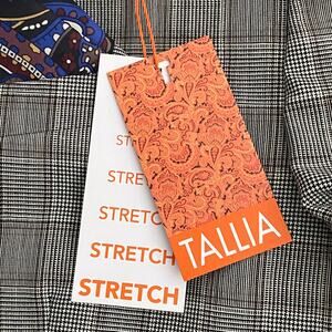 This listing is for a new with tags Tallia Men's 40 Long Verdello Suit Jacket. Fully Lined, Two Button Closure, Two Front Flap Pockets, Welt Pocket at Chest, Notch Lapel, Side Vents, 4-Button Cuff, Natural Stretch Fabric, Wool Blend, Cream & Brown Plaid. 70% Wool, 30% Polyester, Dry Clean Only.