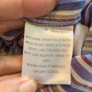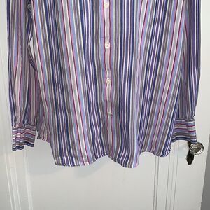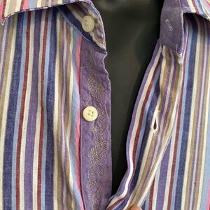 Tallia linen/cotton blue, pink, tan, purple, maroon & white vertical striped long sleeved shirt