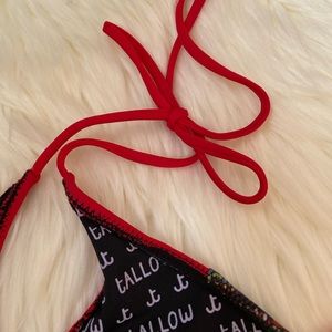 White tallow words on inside of bikini.