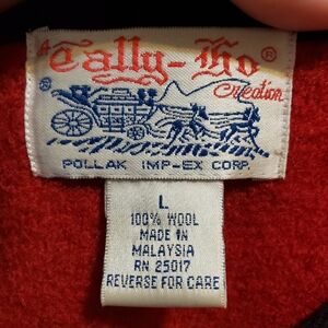 Tally Ho label with intricate design. Made of 100% wool. Crafted in Malaysia.