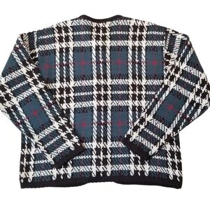 Tally Ho Small Tartan Plaid Teal, Red, White, black Knit Cardigan Sweater