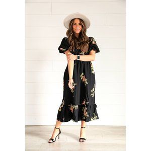 Beauty blooms in the Tally puff sleeve Midi Dress. The well loved Tally floral print shapes a beautiful maxi framed by short, full puff sleeves. A single tier sits at the bottom of the mid length skirt. Wear it with booties, heels or sandals for the perfect fall look. Runs big size down one size.- Puff sleeves- Keyhole- Mid length- Flowy fit- Color: Black CoralSize + Fit - Model is 5'4" and wearing size XS- Measurements taken from size S - Chest: 19 1/4"- Length: 46 1/4"
