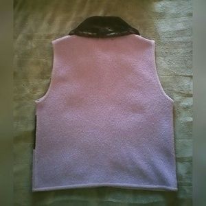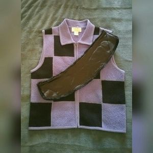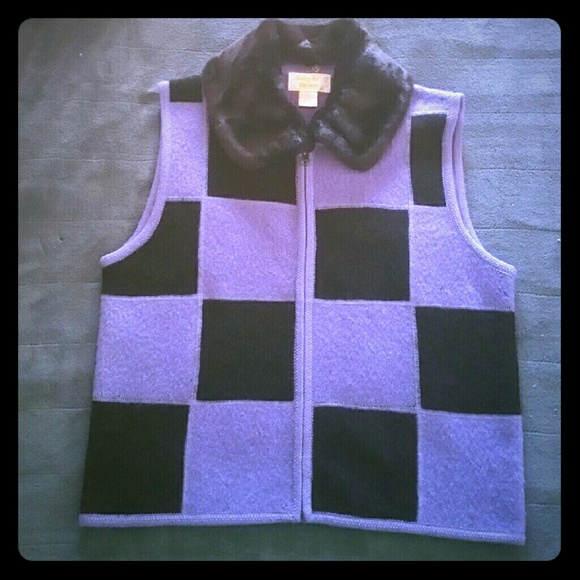 This purple and black sweater vest with removable fur collar. Very warm and great for those football games. 100% boiled wool dry cleaning only!