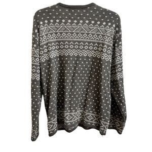 Gray and white fair isle sweater. Blue floral pattern across chest. Front pockets. 100% Acrylic. Missing one button, otherwise good preowned condition. Grannycore. Cottagecore.