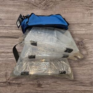 The bag features a padded shoulder strap for comfortable carrying and is accompanied by clear plastic tackle boxes, suggesting its purpose for organizing fishing gear. (Code#36)