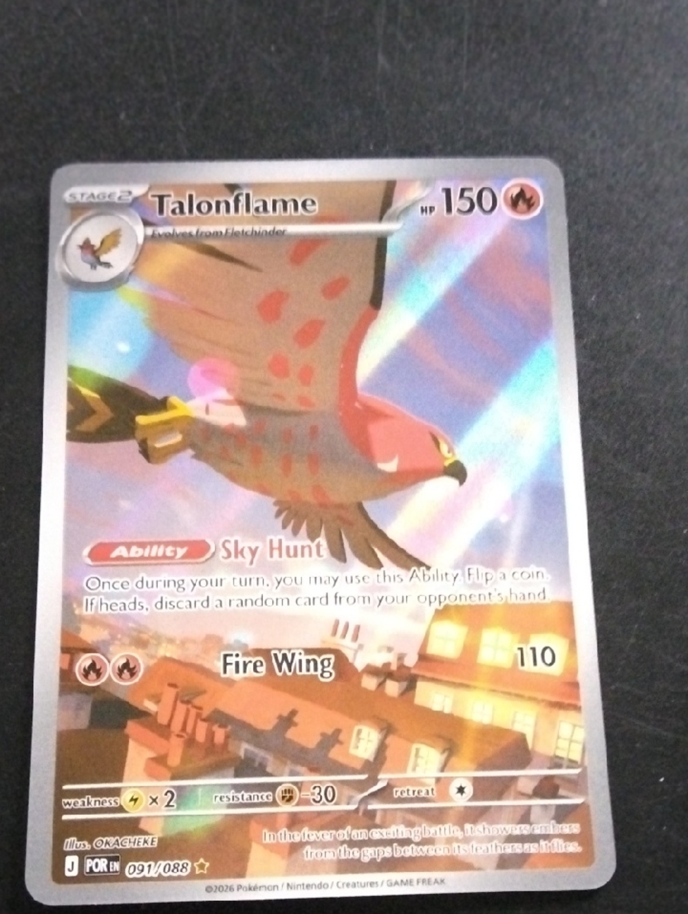 Holographic Talonflame Pokémon card. Vivid red and tan artwork with shiny foil accents. Clean visual with bright rainbow holo effect. Great for collectors and fans.