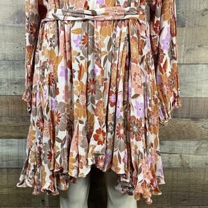 Talulah Gotta Have It Dress. Style# H42838. Size large. Color ~ Brown/purple/orange. Floral print. Long sleeve with elastic cuffs. Tie belt at waist. Keyhole back. Excellent condition. Measurements are in the pictures.