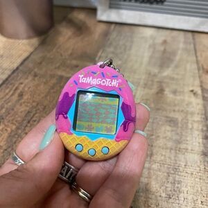 Ice cream with sprinkles shell with white 'Tamagotchi' and blue frame and buttons, and original programming and characters