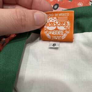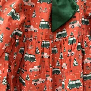 Tamal Con Merengue Modelo 1965 long sleeve dress size 8. Red background with large green bow at neckline featuring green VW vans and pink trucks hauling Christmas trees. So cute and festive for Christmas! Excellent condition.