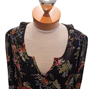 Tamara H Womens Blouse 2X Black Floral Ruffled Neckline Sheer 3/4 Sleeve Spring