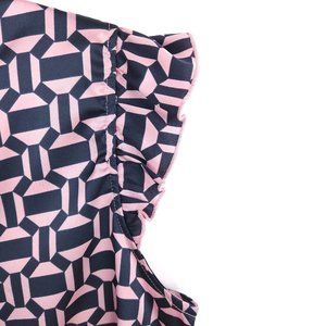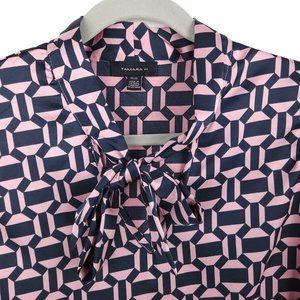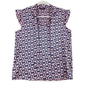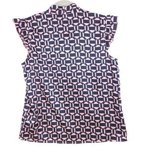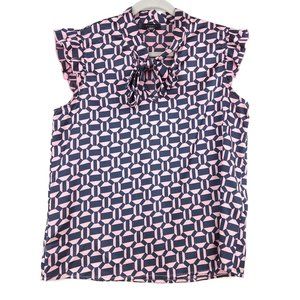Tamara H. Women's Ruffle Cap Sleeve Blouse Size M Black/Pink Geo Print V-Neck Tie