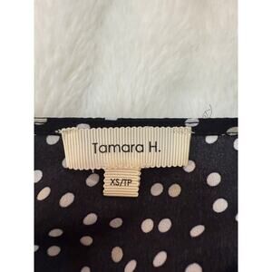 This Tamara H. wrap top is a stylish addition to any wardrobe! The black fabric with a playful polka dot pattern is perfect for dressing up or down. The peplum hem adds a touch of femininity, and the wrap style allows for a flattering and adjustable fit. This top is in excellent condition and ready for a new home!