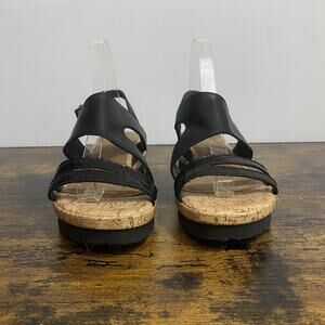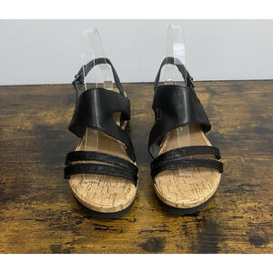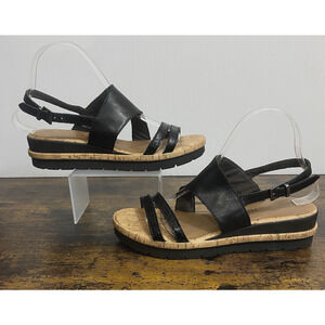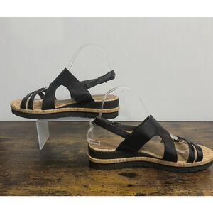 Tamaris Wedge Sandals Womens Sz 7.5 Black Leather Cork Slingback Strappy