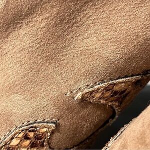 Tan suede like fabric with snakeskin printed accents ina wing or flame shape