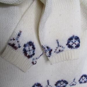 This vintage all wool button-down knit cardigan has a blue Fair Isle style design across the shoulders and along the hemline.