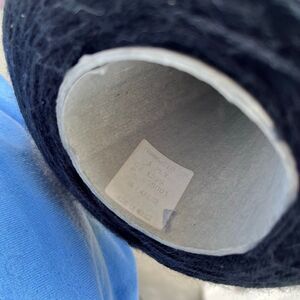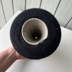 Large cone of Tamm brand black acrylic yarn. This 3-ply yarn is softer and less “plasticky” than typical acrylics, with a thin strand diameter slightly smaller than a toothpick.