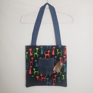Tammy D's Recycled Blue Jean Denim Rainbow Cat Tote Bag. See photos for measurements. Bag has front pocket and two back pockets. No interior pockets and no closure (open style tote).