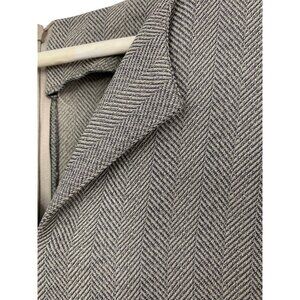 This Vintage Tamotsu New York top features a sophisticated herringbone pattern and a unique V-neck with a flap-over lapel. Made in the USA with a luxurious blend of viscose, acetate, and wool, it's designed for the discerning professional. The cap sleeves and rear zipper add a touch of elegance and functionality.
