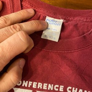 maroon shirt has a nice fade and worn lettering for a lover a well worn shirt. There is a small hole on the front right