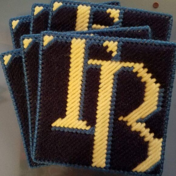 Details: Tampa Bay Rays baseball team logo coasters handmade with plastic canvas and acrylic yarn. there is 6 in the set I use scotchguard on them to keep them nice.