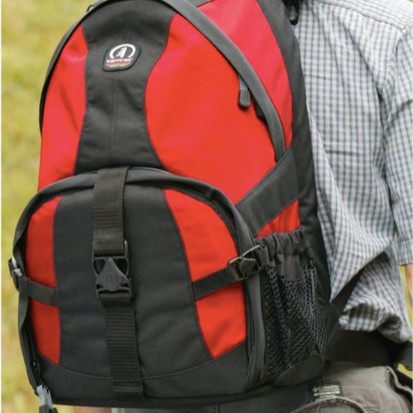Whether you're traveling to your next photo shoot or heading out on a weekend hike, Tamrac's rugged Adventure 9 backpack lets you carry your valuable camera gear securely and comfortably. This spacious bag has plenty of room inside for your SLR camera, several lenses, a flash, power adapters, and more. It even has a dedicated pocket for a laptop computer. The Adventure 9's fully padded camera compartment features adjustable foam dividers so you can customize the space for a snug, protective fit. A see-through accessory organizer on the inside of the flap gives you easy access to your memory cards, batteries, and other small items. Weather-resistant construction helps keep your gear safe from the elements. And soft, padded shoulder straps make for a comfortable fit. large main top compartment with separate removable Pop-Off Pocket™ accessory pouch separate padded laptop computer compartment dual mesh side pockets for quick access to water bottles and accessories sternum strap and hip belt provide even load distribution and stability padded back panel and shoulder straps carrying handle two lash tabs on the bottom for carrying a compact tripod (requires additional accessory straps) internal dimensions: top compartment: 11"W x 8-3/4"H camera compartment: 11-1/2"W x 8-1/2"H x 5-1/2"D laptop compartment: accomodates computers up to 15-1/2"W x 11"H x 2"D weight: 4 lbs., 3 oz. New never used. Retails for $120