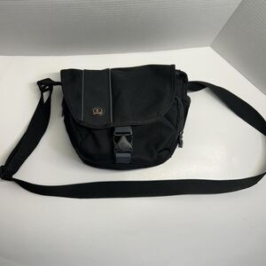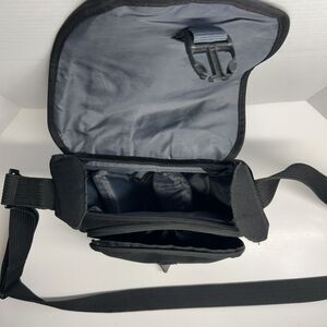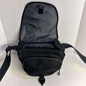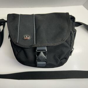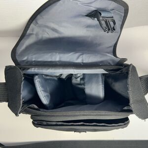 The Tamrac Rally 4 3444 Camera Bag in black and gray is a padded carry/shoulder bag designed to hold various types of cameras, camcorders, and accessories. It features storage compartments, a shoulder strap for easy carrying, and is made of durable poly material. Compatible with compact cameras, DSLRs, lenses, flashes, filters, and more, this versatile bag is a practical choice for photographers on the go.