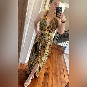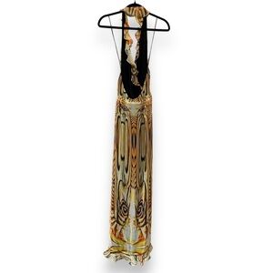 Tamsen Y2K Designer Gold/Brown Abstract Print Ruffle Halter Silk Gown NWT