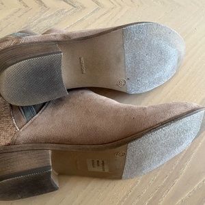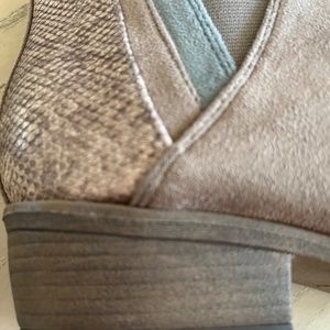 Tan Ankle Pull-On Bootie Size 8.5 by Journey Collection. Almond Toe, Synthetic Lining with a padded footbed, Tan Faux Suede Upper with snakeskin wrapped around back heel, block heels and a synthetic sole.