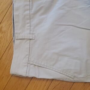 Tan bermuda shorts. Very slight pulling at inner thighs. From smoke-free pet-friendly home.
