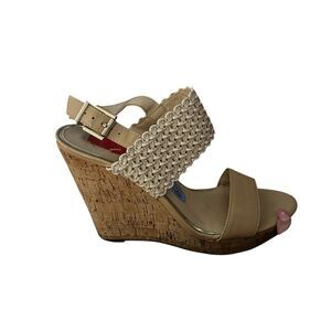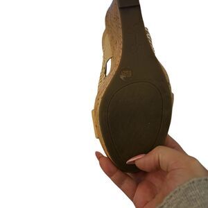 These tan sandals feature a stylish open-toe design with a slingback and an adjustable ankle strap. The woven straps create a unique basket-like pattern, adding texture and elegance. A sturdy heel provides comfort and support for all-day wear. NWT