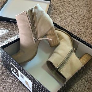 Tan heeled booties. Silver zipper, about a 3in heel. Very comfortable. Only worn a couple of times. Very good condition. Kept in box. Brand I think is from Target.