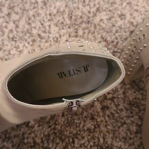 Tan booties with metal heel details. Worn a dozen times or so, still in good shape.