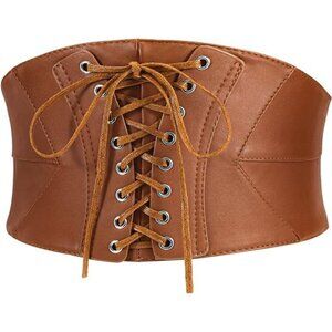 Tan Brown Faux Leather Corset Lace Up Elastic Waistband Cincher Belt Girdle