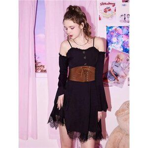 Unleash your inner seductress with this super sleek corset waistbelt! Featuring a sleek black faux leather and chunky lace up bodice that will snatch your waist. Wide, elastic waistband that conforms to your body. Snap button closure in back. O/S. Prepare to make jaws drop with this super sexy leather girdle. ❤️