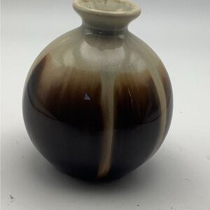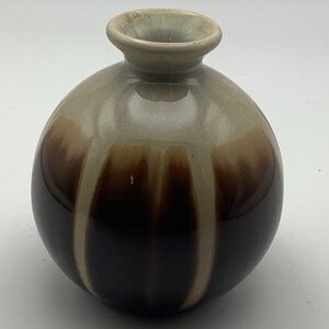 Tan round pottery vase or reed diffuser with brown glaze, creating stripes. Unmarked. Pre-owned, good condition.