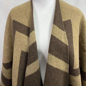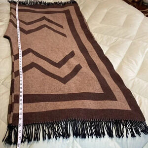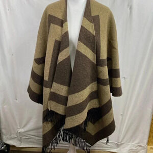 Tan & Brown Shawl Wrap with Fringe. One Size Fits All. Good pre owned condition. No brand or fabric tag. Feels like a Wool blend.