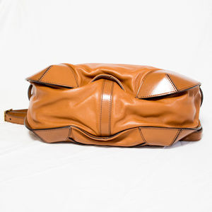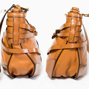 Excellent used condition authentic tan leather Burberry Bridle Dutton Hobo with gold hardware. Bag has both a cross-body strap and a top handle with a top zipper. Used only once or twice in almost perfect condition except for small blemishes on the back between the bridles, on the front left lower bridle, on the top inside of the back wall, and hairline scratches on the hardware (see detail photos).