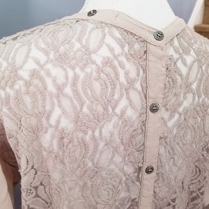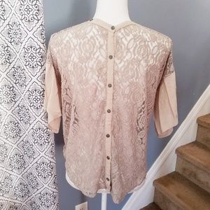 Tan Button Up S/S Blouse with Lace Back & Pockets