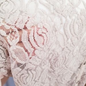 Tan Short Sleeve Button Up Blouse with a full Floral Lace Back and 2 Pockets at the Chest.