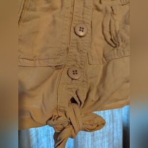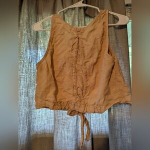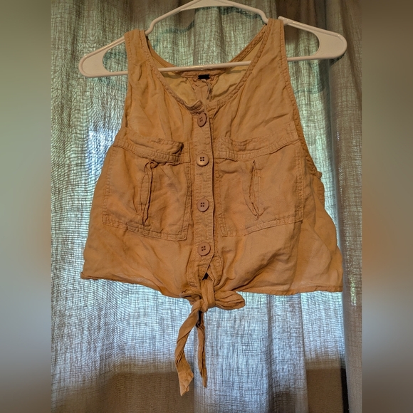 free people stylish tan sleeveless top with button-down front and tie detail.