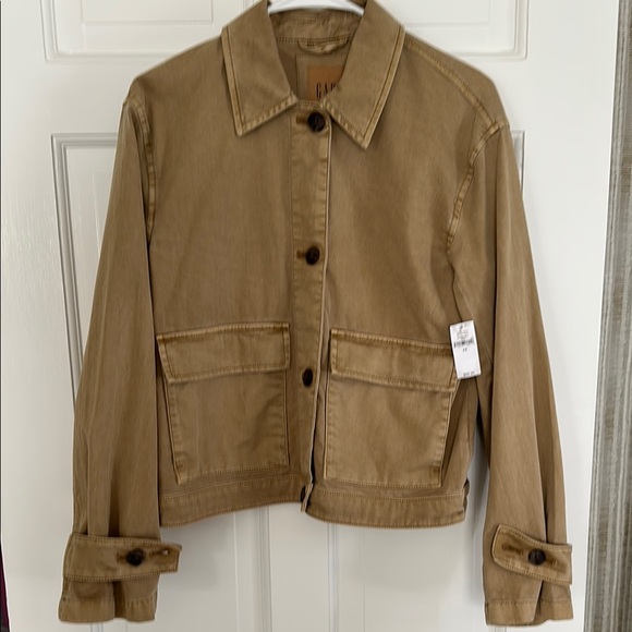 Stylish tan button-up jacket with large front pockets. Perfect for casual wear.