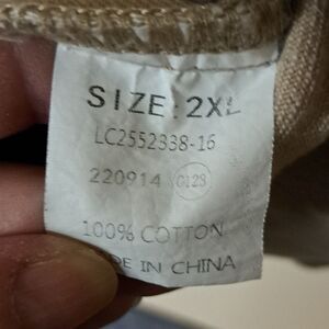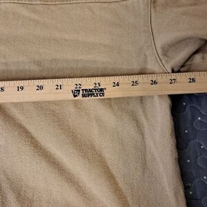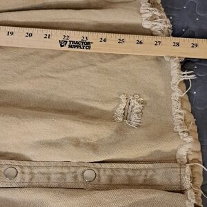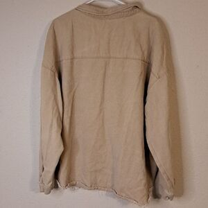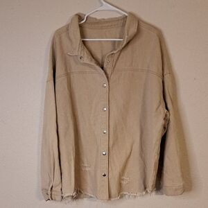 Stylish tan button-up jacket with frayed hem. Perfect for casual wear.