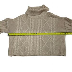 tan cable knit, cropped turtleneck, chunky sweater, textured knit, vintage style, autumn fashion, winter layers, cozy knitwear, trendy knit top, casual sweater