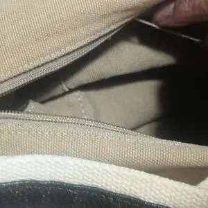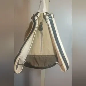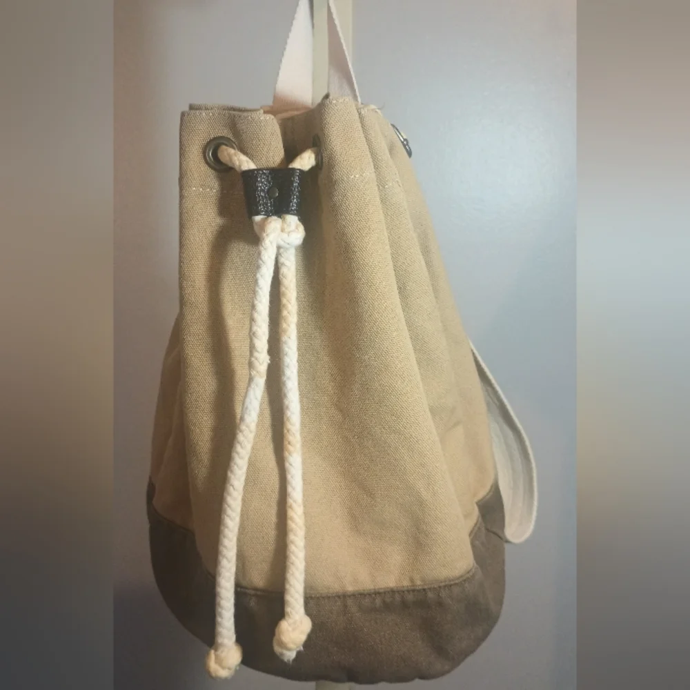 Stylish tan canvas backpack featuring a white rope drawstring closure. Perfect for casual outings.