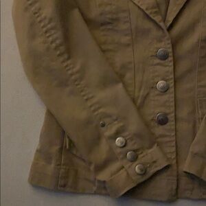 Tan canvas jacket by Bill Blass, Size 8. Very stylish. One button cover missing in sleeve, I wore with cuffs rolled once. Still lots of life left!