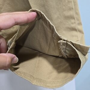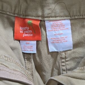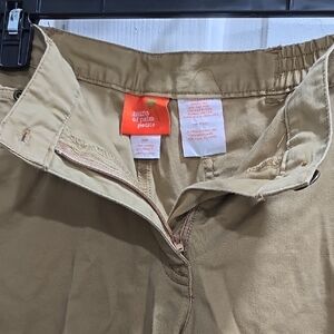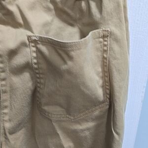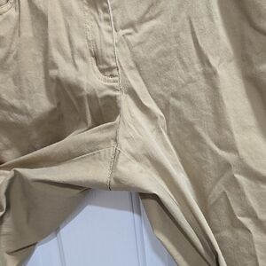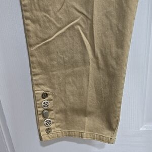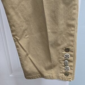 Stylish and comfortable tan capris, perfect for any casual occasion. Front and rear pockets. Button and zipper closure. Decorative feature on the pant legs. Waistband has elastic inserts. Laid out flat the waistband is about 15in. Inseam 21in. Color may vary as pictures were taken with and without flash. Please review all pictures and let me know if you have any questions.