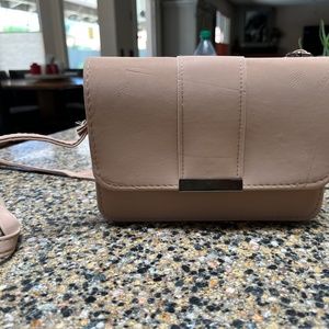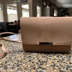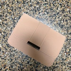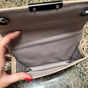 single pocket tan clutch with a matching crossbody strap, closed by black/silver magnetic buttons