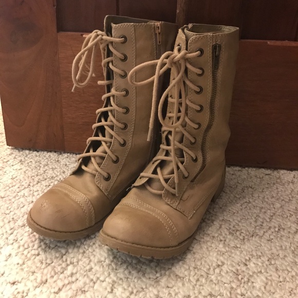 Lightly worn size 8.5 tan combat boots. Buckle detail on back and zippers up both sides.