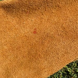 This Vintage Kentfield Split Cowhide jacket is made of genuine leather on the shell and has a 100% nylon lining. There is a small red dot (pictured) on the jacket but it is not noticeable.